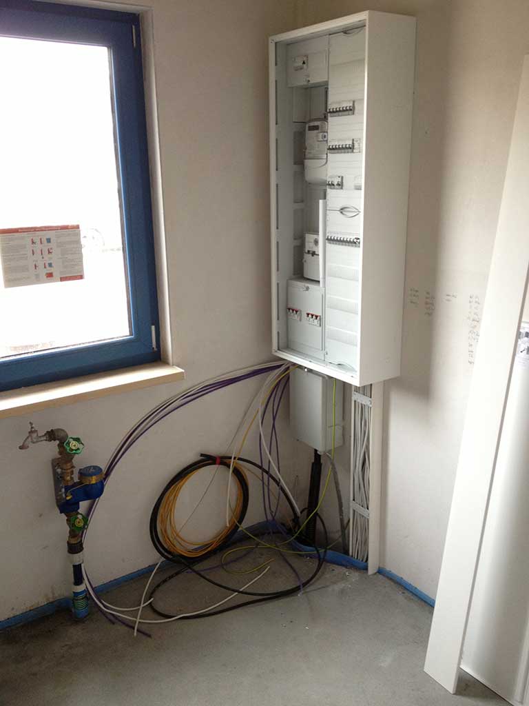 Seit dem Wochenende waren wir mehrmals vor Ort um den Estrich mit Frischluft beim Aushärten zu unterstützen. Die Wartezeit nutzten wir jeweils für ein paar Aufräumarbeiten auf dem Grundstück. Am gestrigen Montag wurde dann der Elektro-Hausanschluss abgeschlossen und die Elektroinstallation fortgeführt. Telefon- und Medienkabel wurden ebenfalls ins Haus geführt.