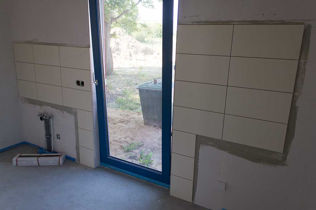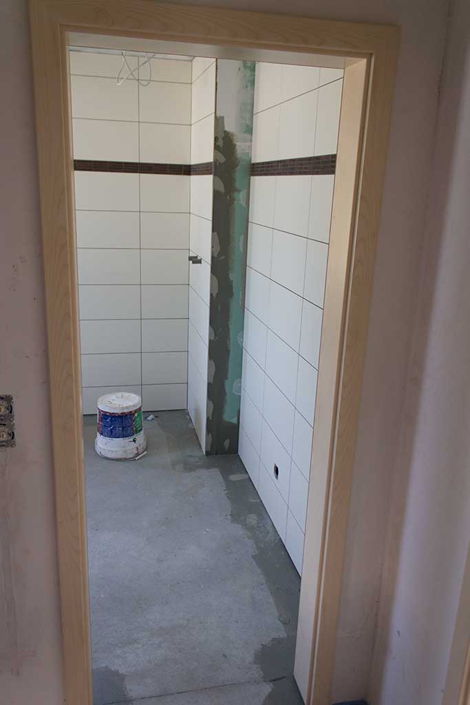 Zum Wochenende konnten wir nun die fertig installierten Innentüren sowie erste Fortschritte des Fliesenlegers bestaunen. Dieser hat vor allem die Fensterbänke in den beiden Sanitärräumen modelliert, im EG das Gäste-WC weitestgehend an den Wänden verfliest, im OG auch einen Teil der Wand-Verfliesung geschafft und in der Küche den Fliesenspiegel angebracht.